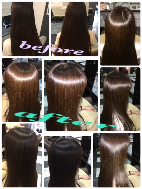 カウンセリング→プレシャンプー→栄養補給→栄養補給→ヒアルロン酸→カラー塗布→乳化プレリンス→ラテスパ→シャンプー→アルカリ除去→栄養補給+コルテックスR→リンス→弱酸性→保護剤→ドライ→ハンドブロー→カット